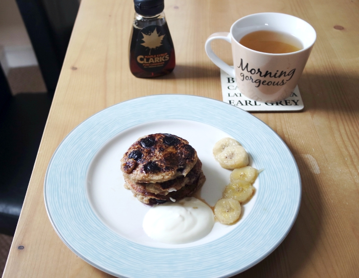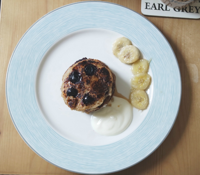 Instead of eggs, milk and flour, these pancakes are made with mashed banana, coconut/almond milk and oats. With blueberries bursting in the middle, a generous dash of maple syrup and a dollop of natural yoghurt & caramelised bananas on the side.