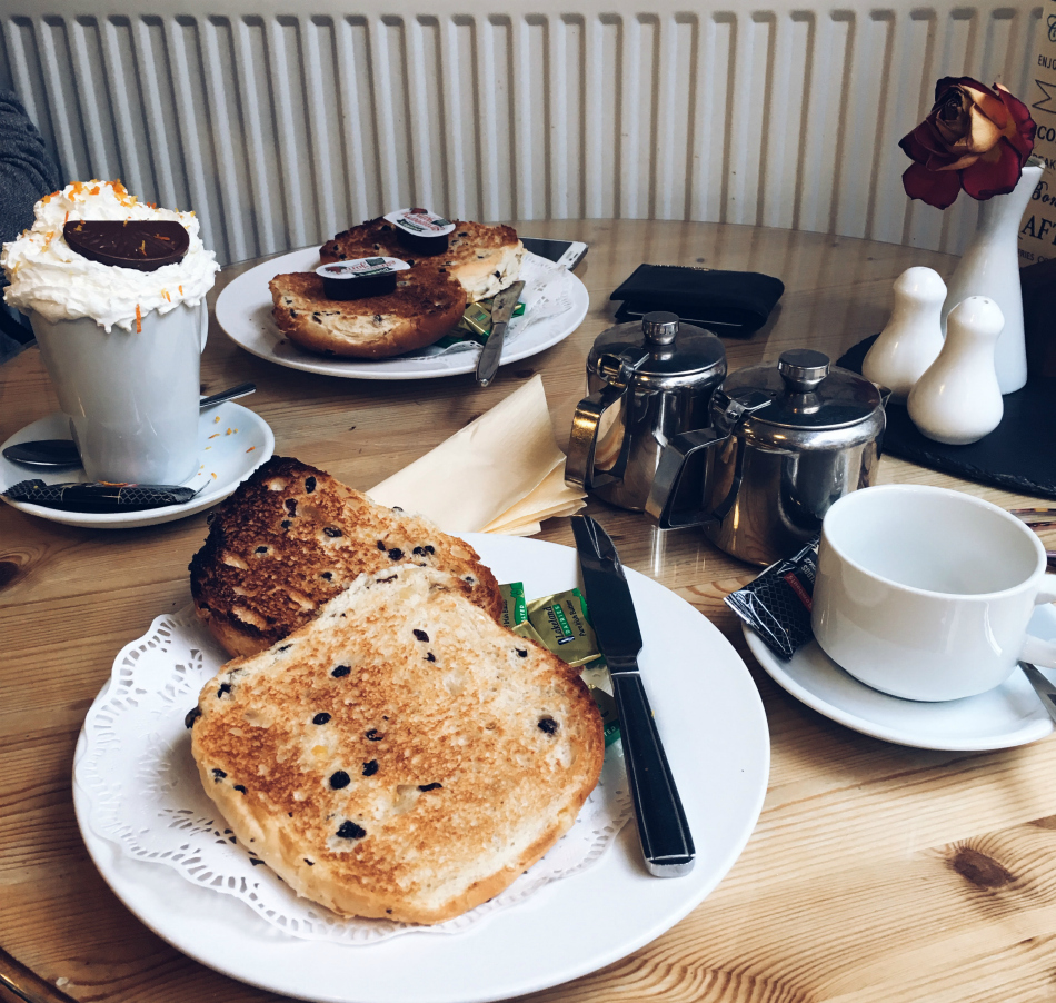 I'd definitely recommend visiting 'Crumbs n Cobbles', if you're taking a visit to Whitby as it's a really reasonably priced cafe that's oh so Insta-worthy. Josh ordered a Terrys orange hot chocolate and it looked amazing. I was a tad jealous whilst sipping on my green tea, not gonna lie. We both had toasted teacakes to eat that were about the size of my head and were seriously delicious.